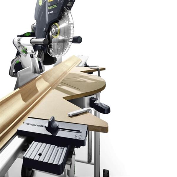The crown stop guarantees easy cutting of cornices in combination with trimming attachments and the underframe. The crown stop can also be used as an extension table.